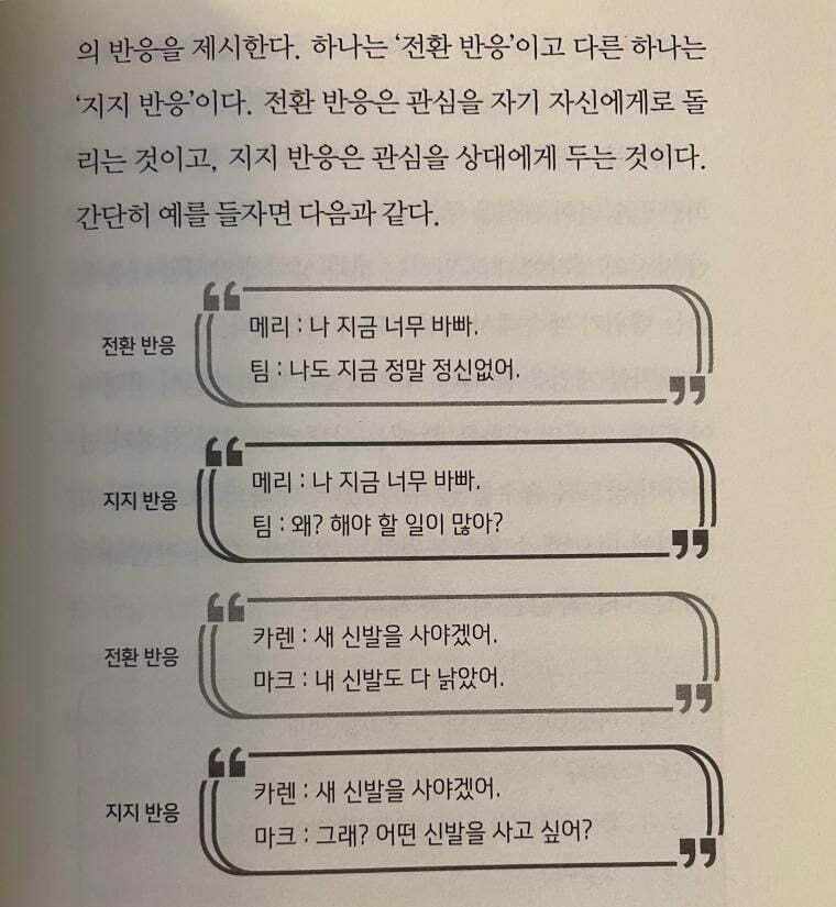 반대로 지지 반응은 상대방이 자신의 이야기를 계속 할 수 있도록 도와주는 화법