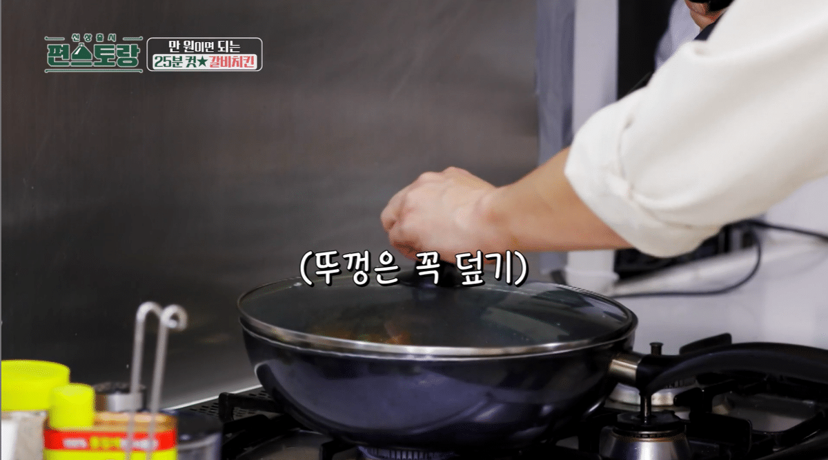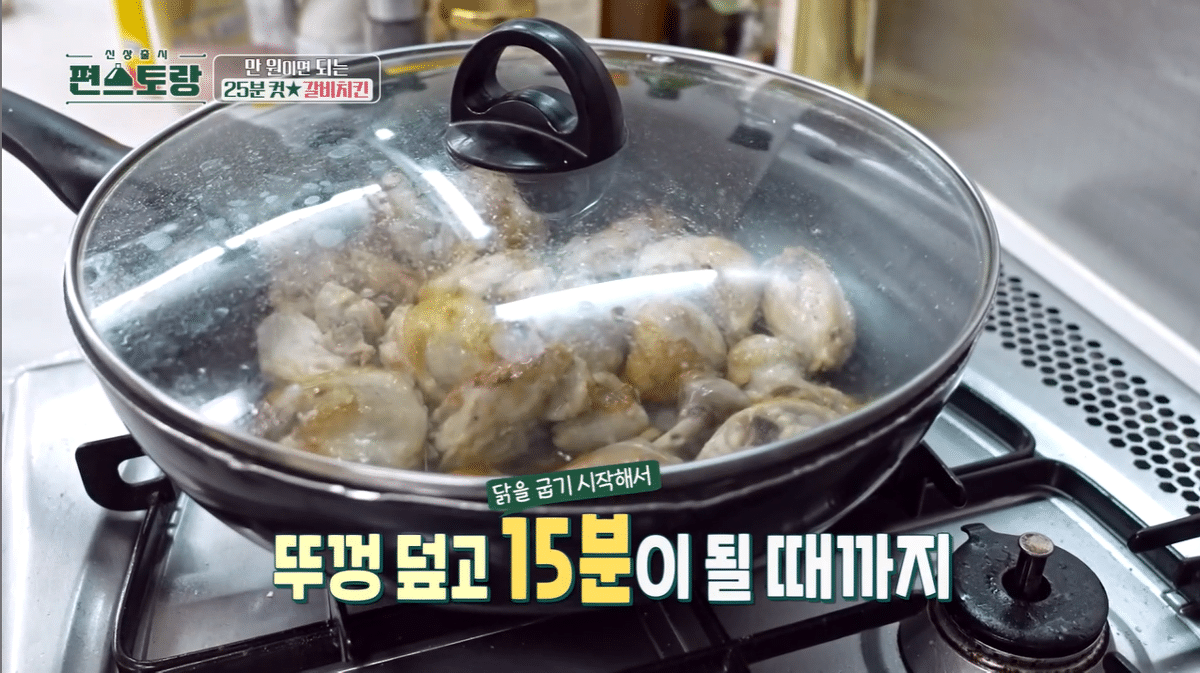 뚜껑 덮고 닭 굽기 시작해서 10분 정도 더 구워주기