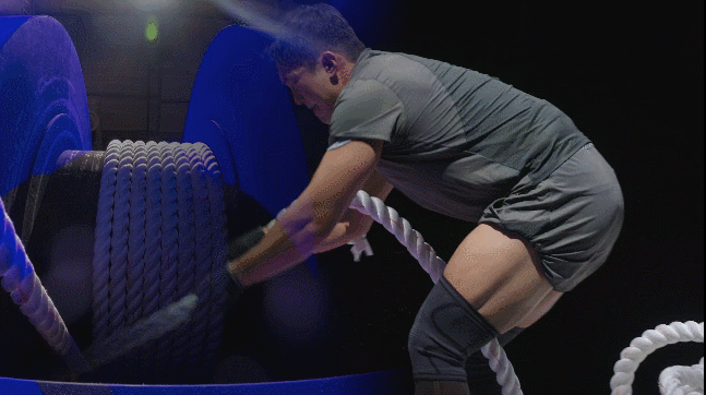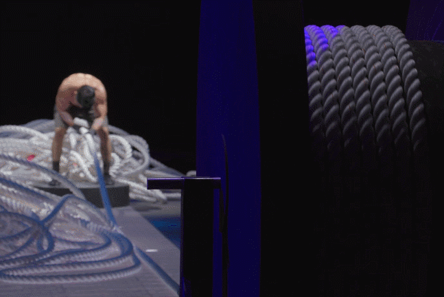 우진용. 로프가 바닥에 끌릴만큼의 힘으로도 쉽게 당겨온다.