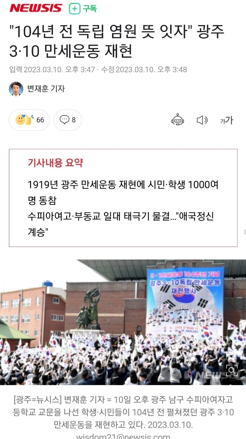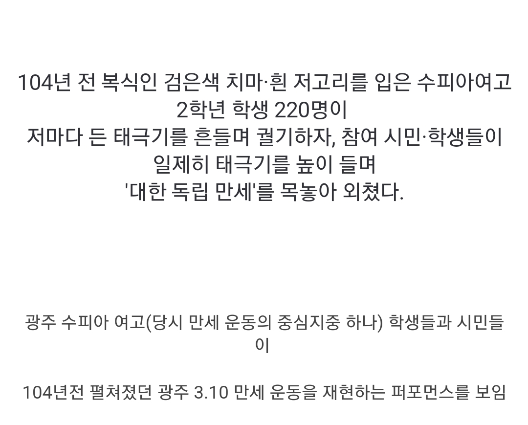 104년 전 복식인 검은색 치마·흰 저고리를 입은 수피아여고 2학년 학생 220명이 저마다 든 태극기를 흔들며 궐기하자, 참여 시민·학생들이 일제히 태극기를 높이 들며 '대한 독립 만세'를 목놓아 외쳤다.