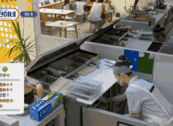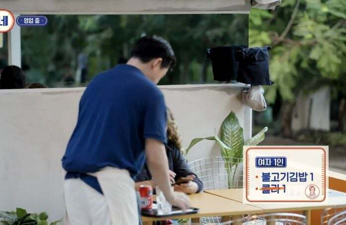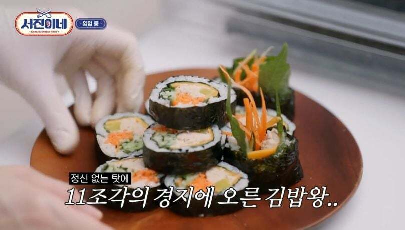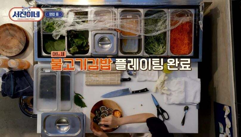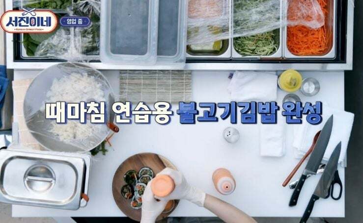 때마침 김밥 썰고 있을 때 손님이 왔고 불고기김밥 내갔고