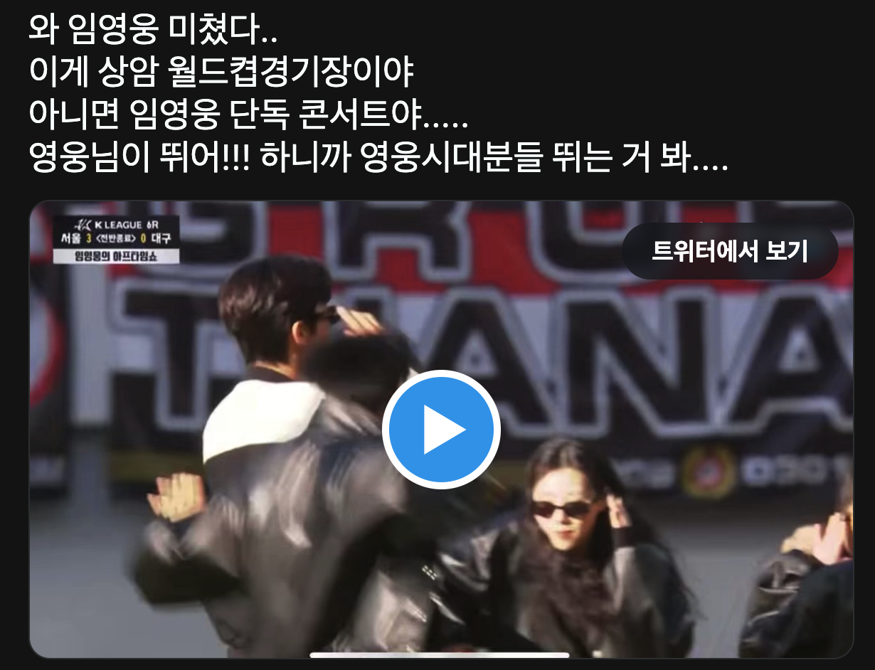 “와 임영웅 미쳤다.. 이게 상암 월드켭경기장이야 아니면 임영웅 단독 콘서트야..... 영웅님이 뛰어!!! 하니까 영웅시대분들 뛰는 거 봐....”