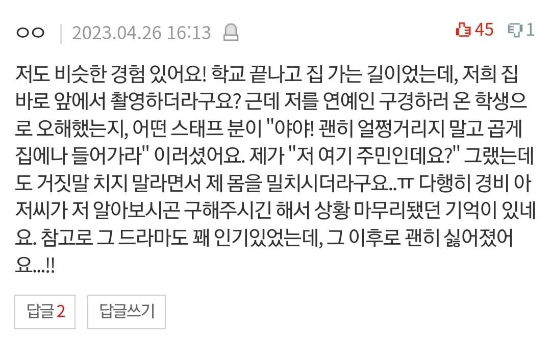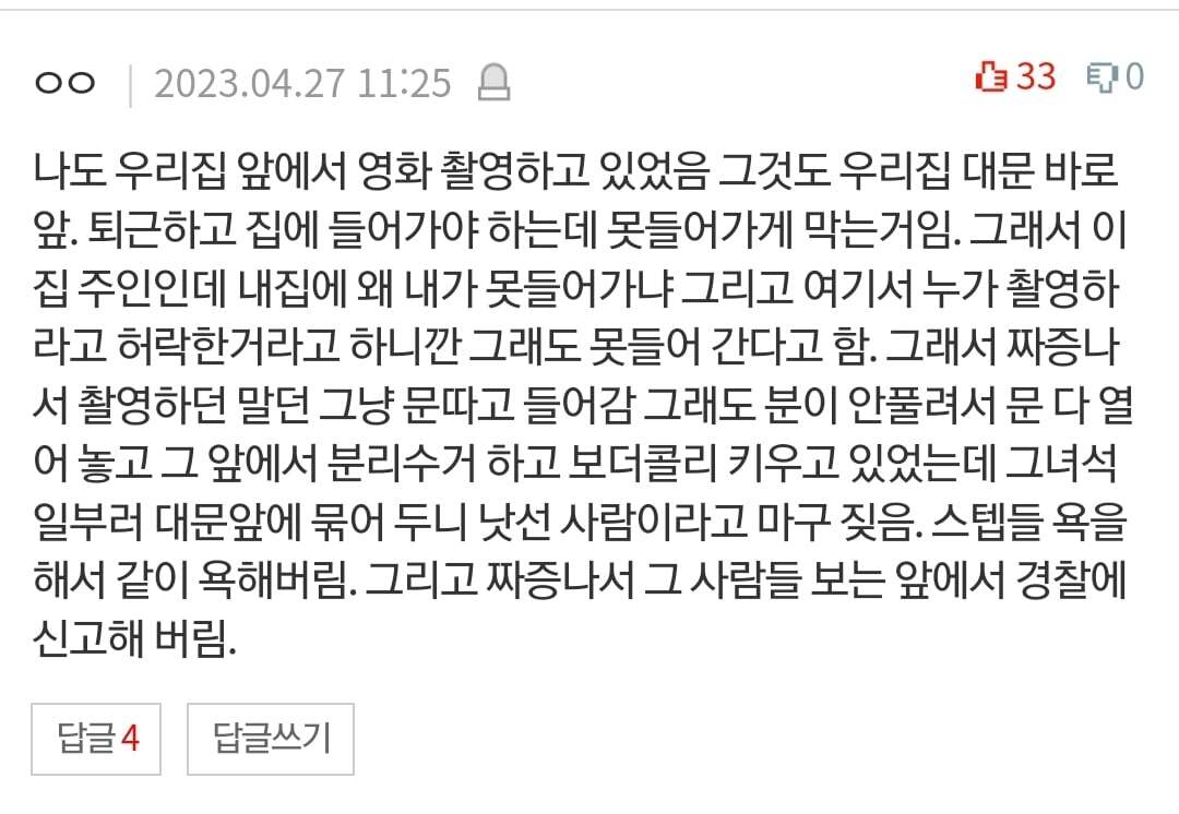 저 드라마 아니래도 방송촬영 민폐쩌는 듯본인집도 못 들아가게 함