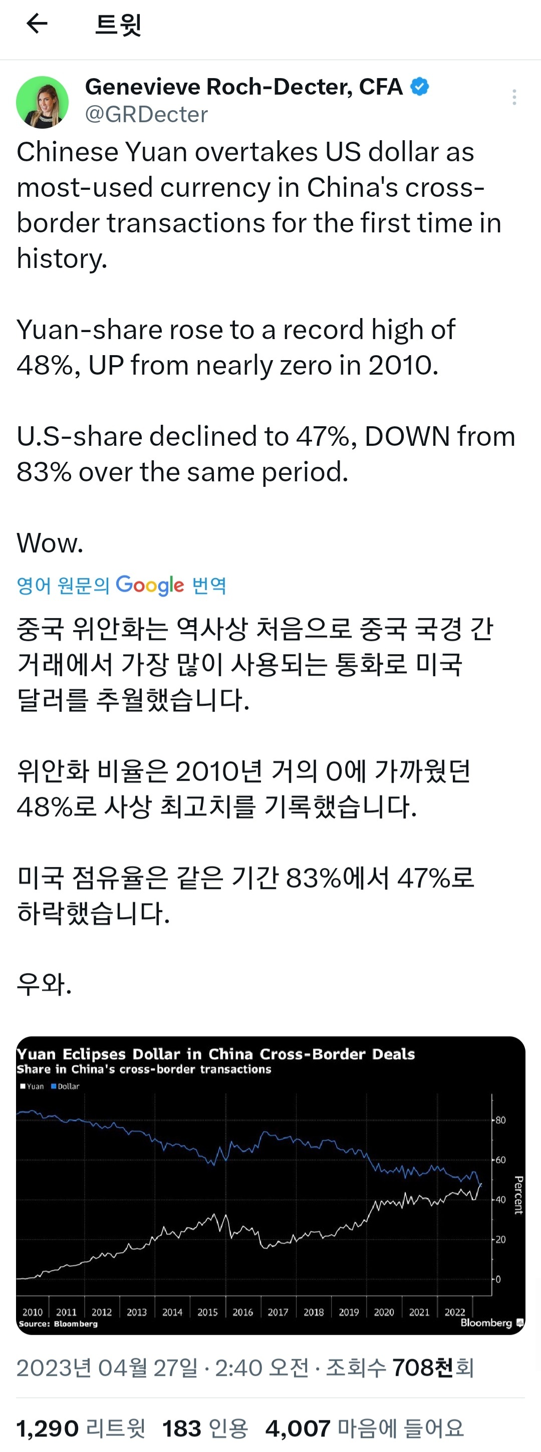 역사상 처음으로 중국의 무역거래에서 위안 사용 비중이 달러를 역전 23년 3월 위안화를 통한 거래규모는 5500억 달러, 우리나라 돈으로 736조 원 가량 물론 세계 전체로 보면 여전히 달러가 압도적이지만 재미있는 현상인 듯 전세계 무역에서 비중은 달러 83~4%, 위안 4.5%