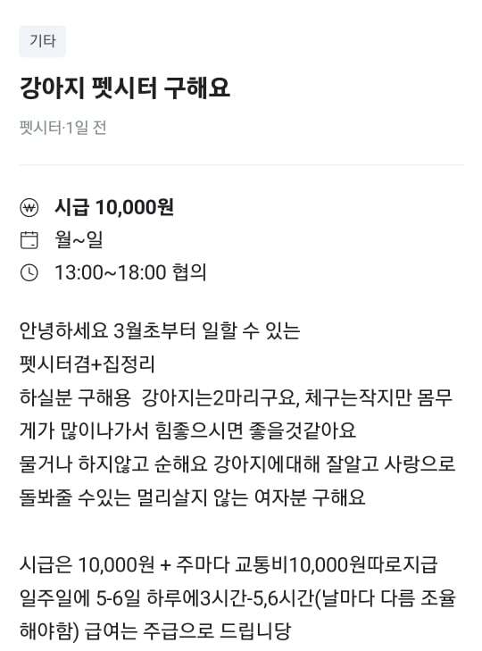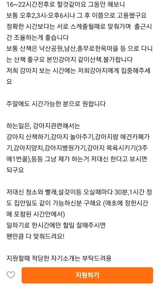 강아지 2마리 산책, 놀아주기, 애견카페, 양치, 병원, 목욕, 집안청소, 빨래, 설거지(공고에는 설겆이..)하실 분