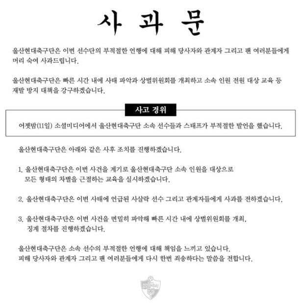 울산현대 이명재의 피부색이 까무잡잡하다는 이유로 인스타에서 동남아 선수 운운하며 놀고 있는 울산현대 일부 선수 및 매니저