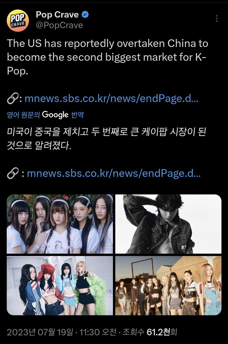 최근에 미국의 k pop 시장이 중국보다 더 커졌다고 한다