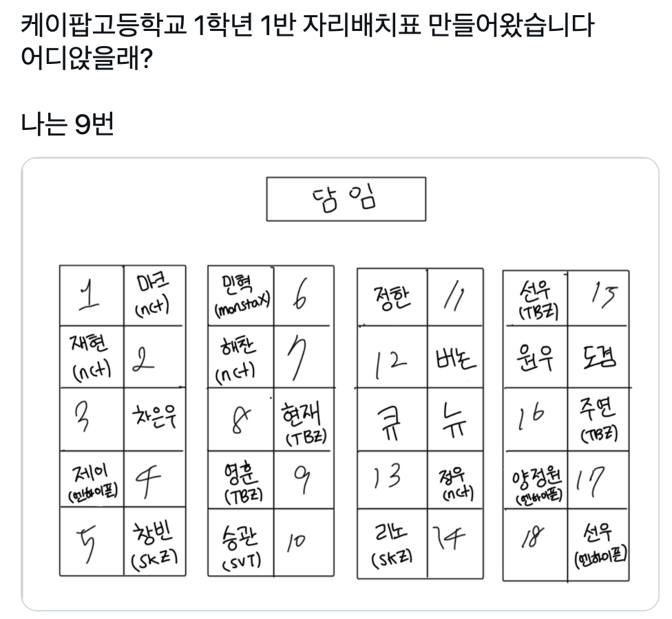“케이팝고등학교 1학년 1반 자리배치표 만들어왔습니다 어디앉을래? 나는 9번”
