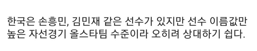한국은 손흥민, 김민재, 이강인, 황희찬 같은 빅리거들이 많지만 선수이름값만 높은 자선경기 올스타팀을 보는거 같다. 오히려 한국 같은 팀이 상대하기 쉽다.