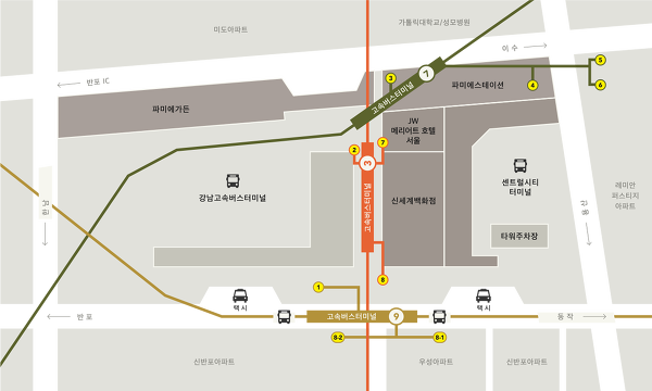 경부선터미널.. 센트럴시티.. 신세계백화점.. 지하상가.. 엔터식스 강남.. 파미에스트리트.. 파미에스테이션..