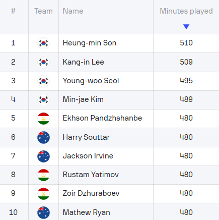 아시안컵 출전시간 1위~10위
