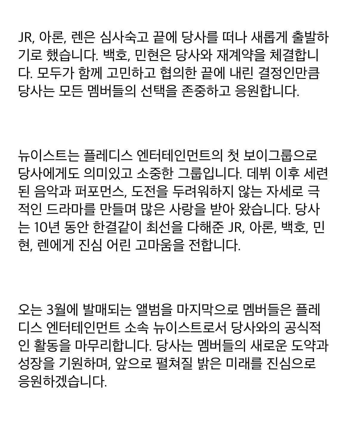 "백호·민현은 재계약…JR·아론·렌은 새 출발" 뉴이스트가 10년 만에 각자의 길을 간다. 백호와 민현은 현 소속사 '플레디스 엔터테인먼트'와 재계약을 맺었다. JR, 아론, 렌은 플레디스의 품을 떠