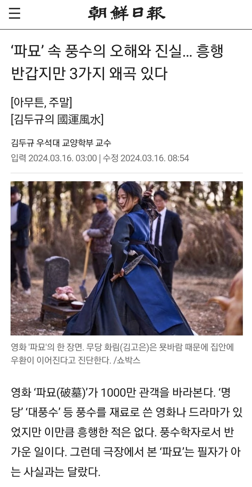 후반부는 무당 화림과 풍수사 상덕(최민식)이 쇠말뚝을 없애는 판타지로 점프한다. 영화는 허구이고 창작의 자유가 있다. 그러나 그것이 역사와 시대를 논할 때는 사실에 근거해야 한다. ‘파묘’에는 세 가지 왜곡이 있다.