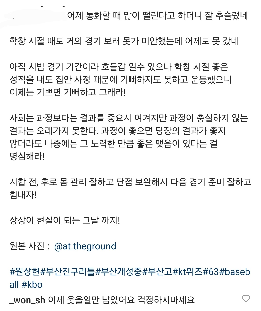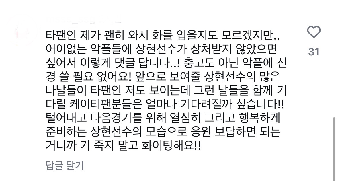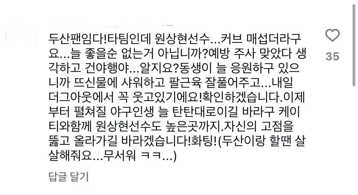 +) 응원댓글 단 사람들이 좋아요가 하나씩 눌려서 누군지 보니 선수 아버님이 댓글 다 좋아요 눌러주고 계심 ㅠㅠㅠㅠ 아버지 인스타글 보니 저렇게 열심히 하는 선수는 이유가 있구나 하고 더더 개같이 응원..
