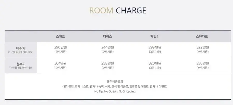 위에 저 요금표를 내면 기차요금 + 숙박비 + 각 끼니별 식비 + 그 외 모든 부대서비스를 이용하면서 단 1원도 더 안 내도 됨