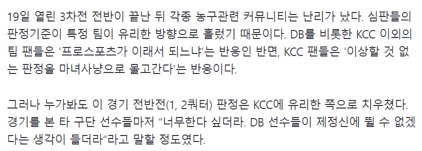 문제는 동일선상 기준 파울이다. 11분 6초를 뛰고 5반칙을 당한 김종규에 대해서는 2개가 오심, 2개는 동일한 기준에서 김종규는 파울이 불린 반면, KCC선수들은 불리지 않았다는 걸 인정했다. 이선 알바노, 디드릭 로슨 역시 여러 장면에서 KCC 선수들과 동일 선상에서 판정이 적용되지 않았음을 인정했다.