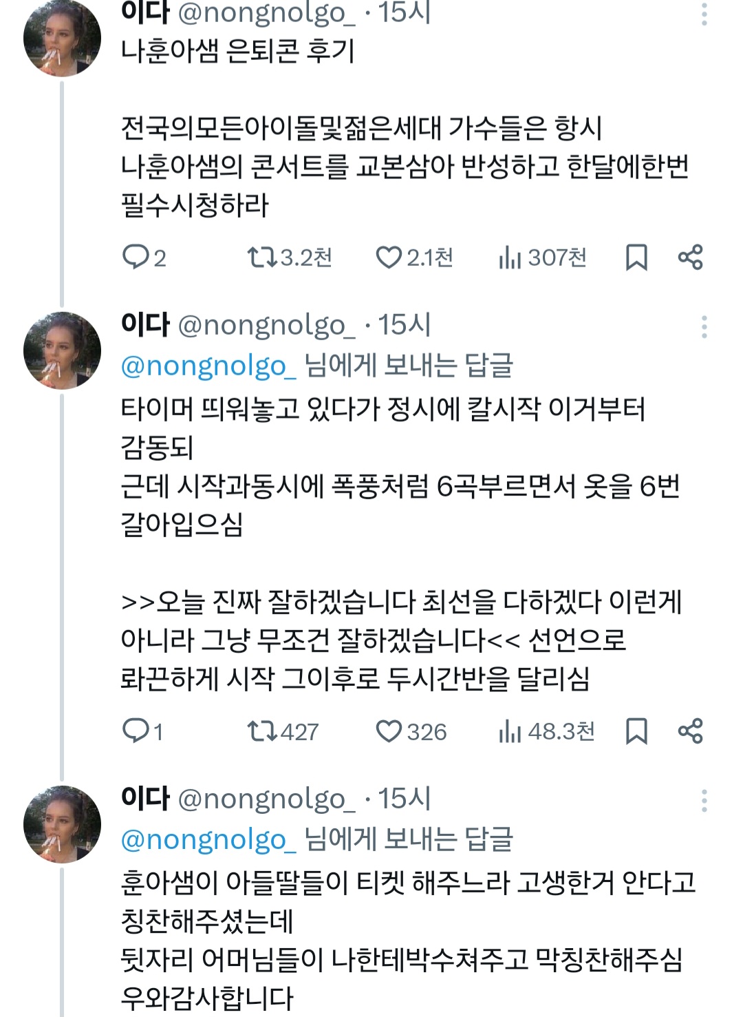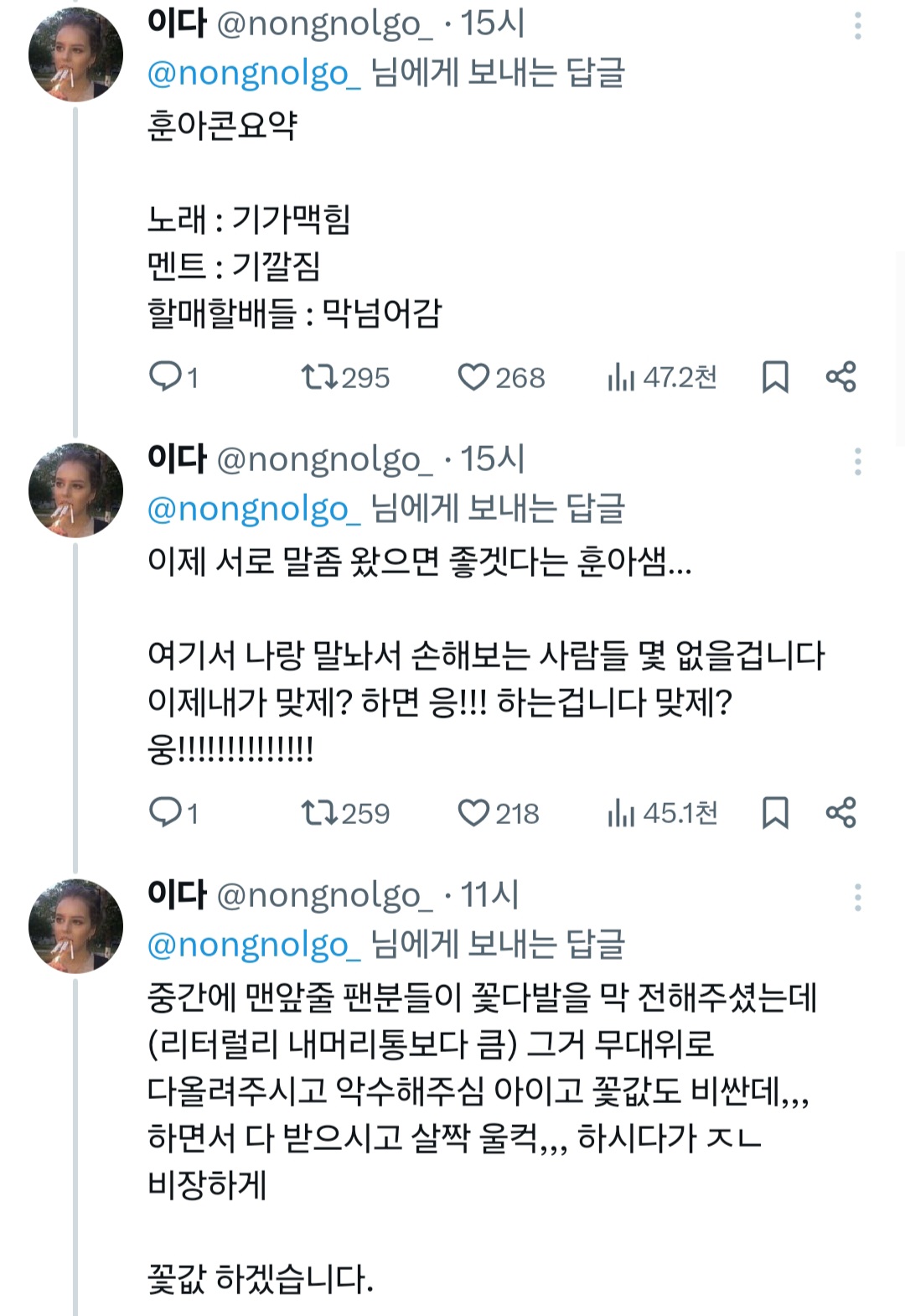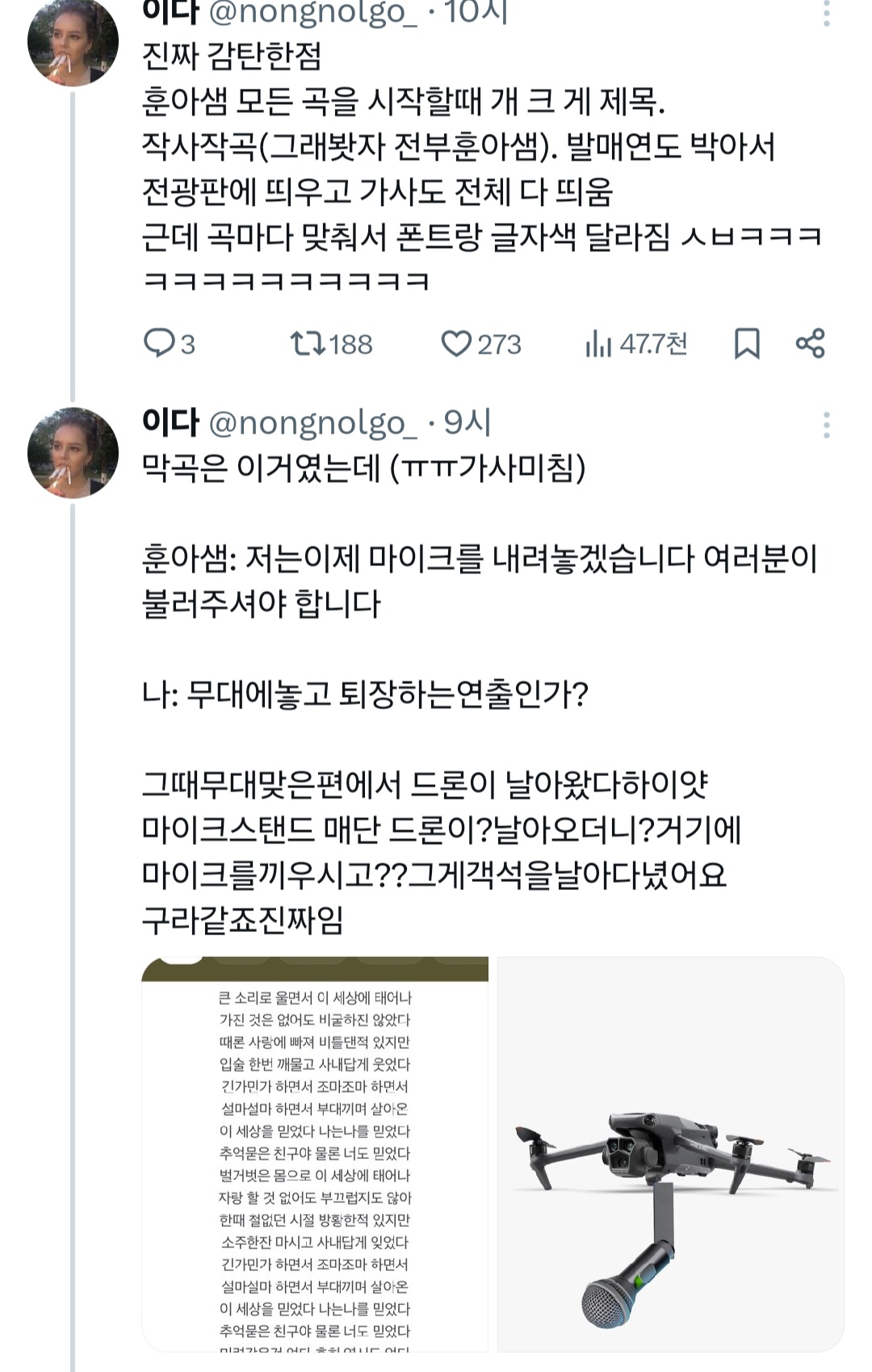 공연 막바지쯤에 훈아샘 : 대한민국 큰일이났다 다들 애를 안낳고 인구감소가어쩌고 나 : 음그래 훈아샘연세가 잇으니 참자 훈아샘 : 젊은이들이 안낳으니 우리라도낳아야합니다 우리가정신차려야 나 : ? 훈아샘 : 여러분들 그럴수있게 제가 청춘을 돌려드리겠습니다 청춘을~~~~돌려허다호오오