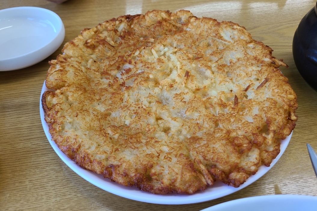 여기는 매운막국수가 따로있어서 좋아하는집! 아마 매운막국수에만 고기소보루 넣어줄거야! 사진도 내가 찍은 매운막국수사진! 여기 감자전 사진은 없어서 인터넷에서 긁어왓는데 꼬옥 이거 먹오보라고ㅋㅋㅋ걍 이렇게 폭력적 비주얼과 폭력적인맛ㅋㅋㅋ외지인한테 유명한집인진 모르겠는데 웨이팅...길어...ㅎ 그래도 금방줄어드는편 주차장은 있는데 여기 사람 많아서 항상...길거리에 대야함ㅠ