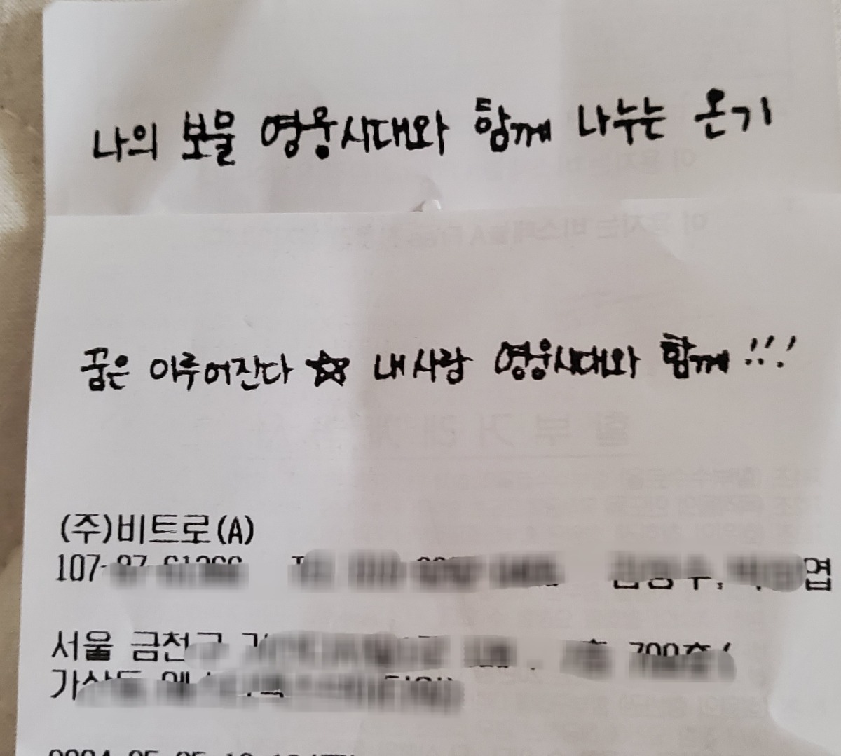 MD구매하면 영수증에 임영웅 자필 멘트 찍혀나옴