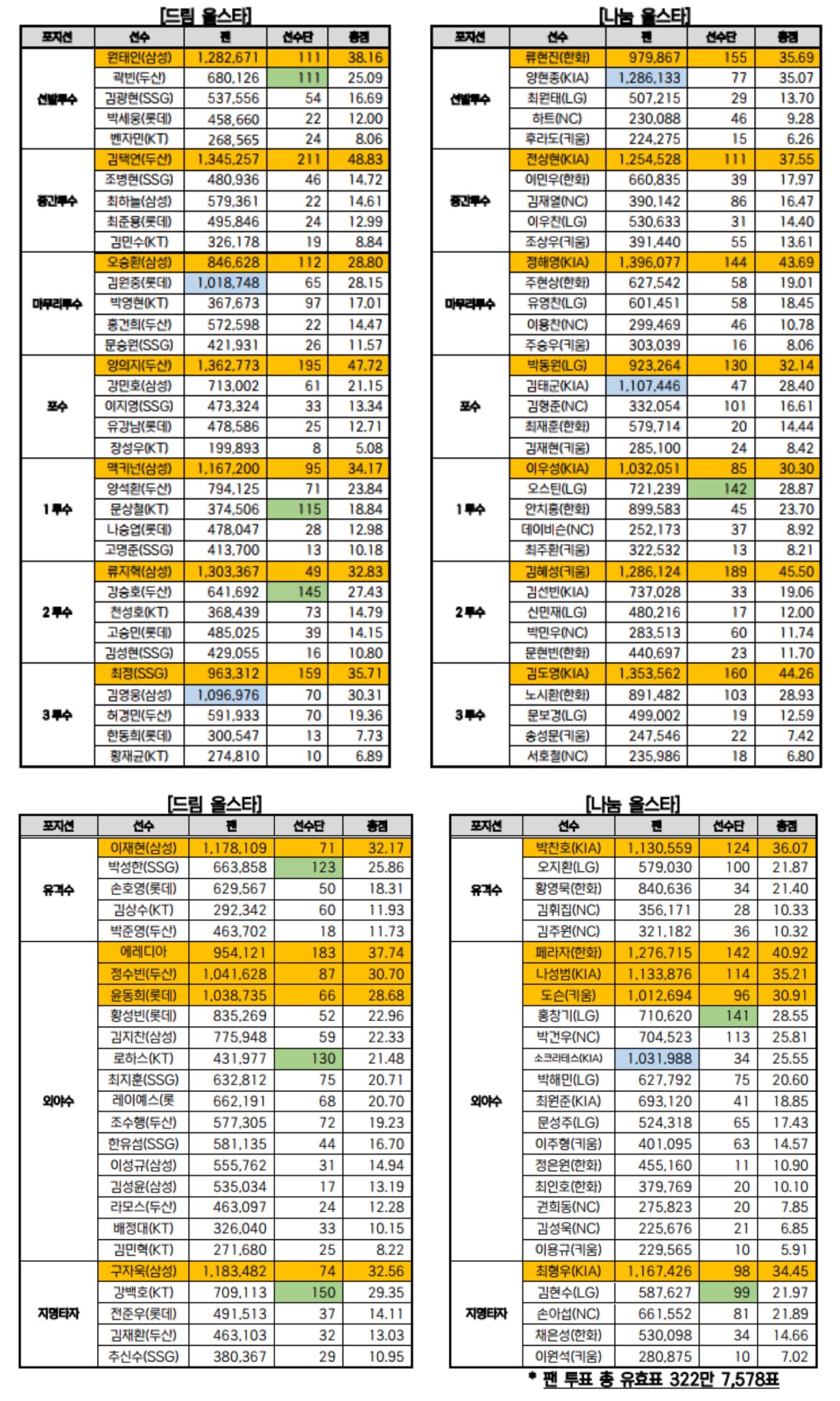 KBO 올스타전 팬 투표 1위가 선수단 투표로 뒤집힌 포지션 나눔 선발 : 양현종(KIA)→류현진(한화) 나눔 포수 : 김태군(KIA)→박동원(LG) 나눔 외야수 : 소크라테스(KIA)→도슨(키움) 드림 마무리 : 김원중(롯데)→오승환(삼성) 드림 3루수 : 김영웅(삼성)→최정(SSG)