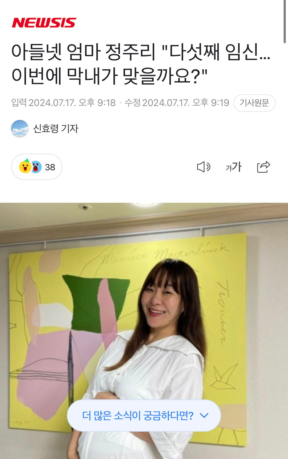 지난달 17일, 다섯째 임신 소식을 전한 정주리는 “첫째부터 지금까지 계획한 적은 단 한번도 없었다. 너무 감사하게 다섯째가 찾아와줘서 행복한 날을 보내고 있다”고 밝혔고, 난소에 난 혹 때문에 한쪽 나팔관을 제거해 임신 확률이 높지 않음에도 다섯째까지 임신할 수 있어 기쁘다고 전했다.