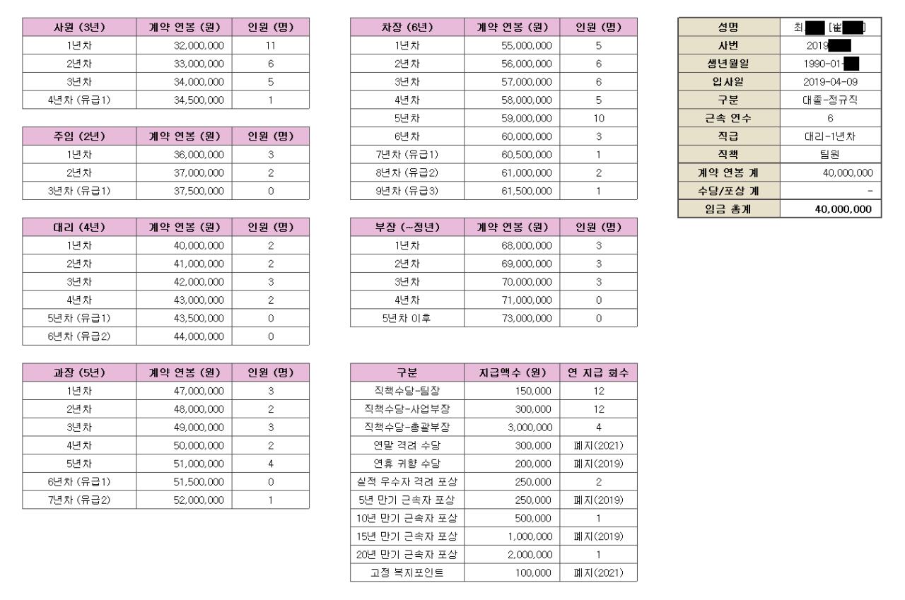 한 중소기업 연봉테이블인데 경리가 실수로 관계자들만 보는 ERP 연봉조회를 직원 전체 다 볼 수 있게 해버려서