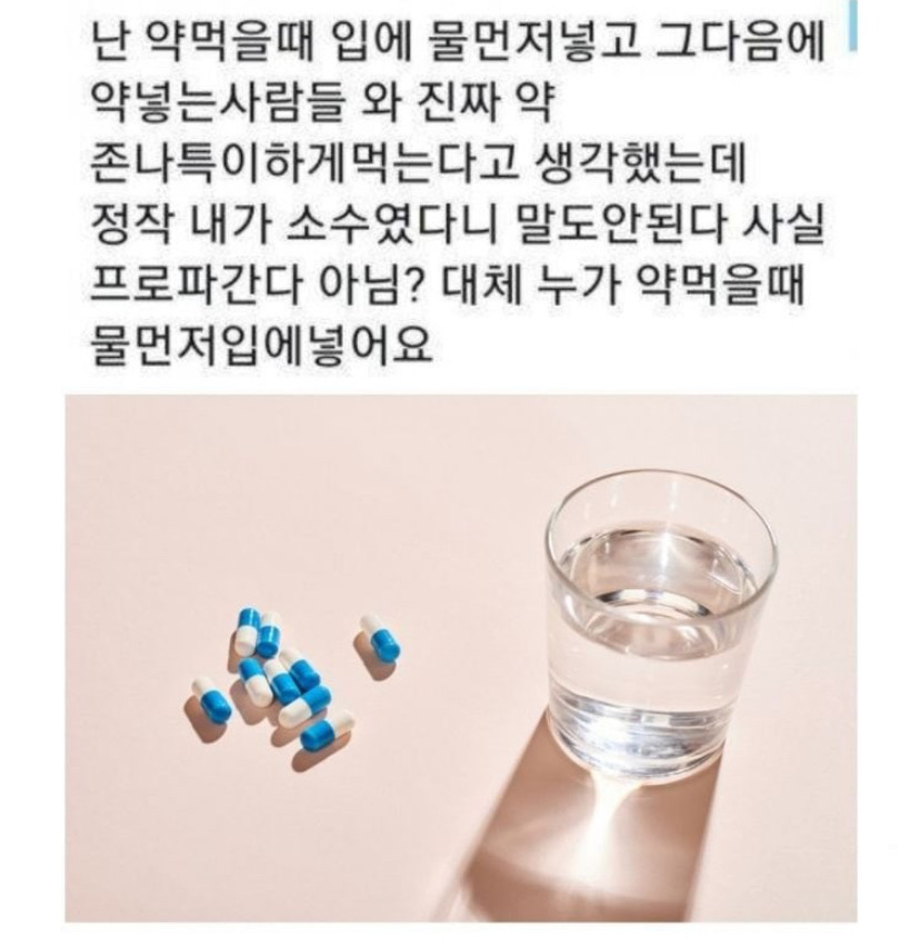 물 먼저 넣고 알약넣는거 나도 첨 봤는데 내가 소수라고? ㄴㅇㄱ
