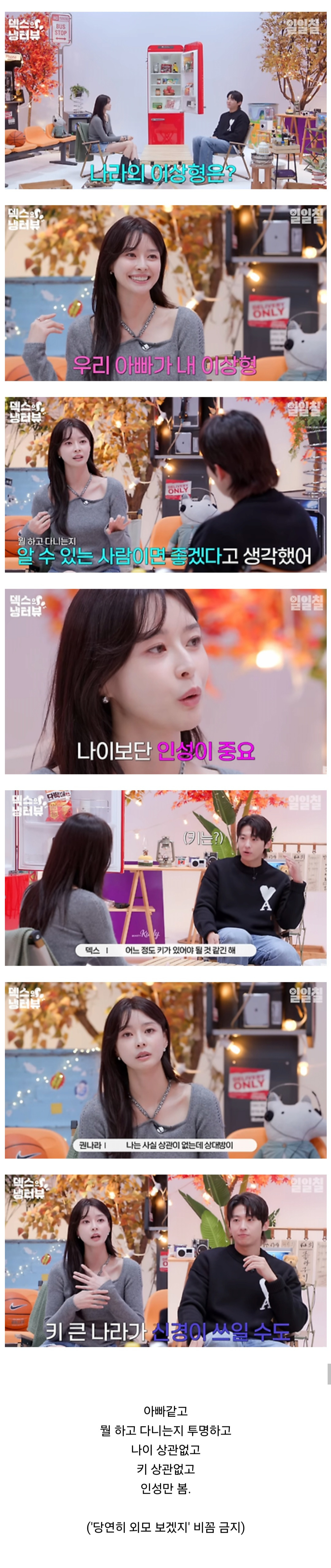 정확힌 나이 상관없고라기보단 나이보단 인성,키는 권나라는 상관없는데 상대가 신경쓰일 수도 있어서 키는 어느정도 있어야 된다함