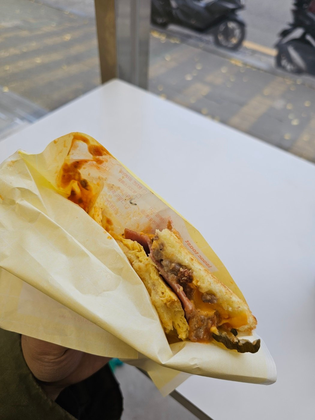 맛있어서 허겁지겁 먹다가 까먹고 뒤늦게 사진 찍음 라구 소스에서 신맛 나오고 계란, 감자가 중간에서 짭짤하게 밸런스 잡아주고 이삭토스트 특유의 단달한 맛 섞이니까 그냥 너 이 맛 좋아하잖아 허접련아 선포하면서 목구멍 찔러들어온 맛이 잘만들었다 못만들었다 따지기 전에 그냥 인간사료처럼 무한으로 입속에 들어감; 잘 만든 음식보다는 맛의 덩어리, 조합물이라는 감상인데 석박들의 얄팍한 노림수에 뇌를 유린당한 느낌 최근 몇달 중에 먹은 버거,토스트류 중에서 제일 맛있는데 인정하고 싶지가 않음