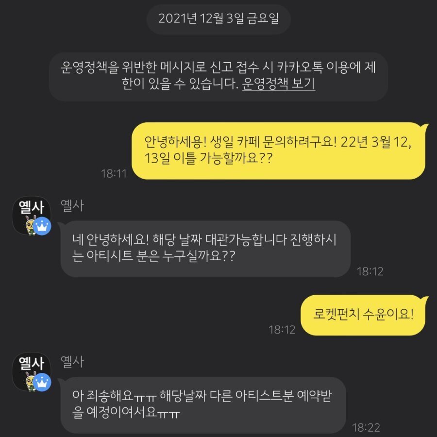 요약 : 아이돌 생일에 카페 이벤트 예약하려다가 인기 없어서 거절당함