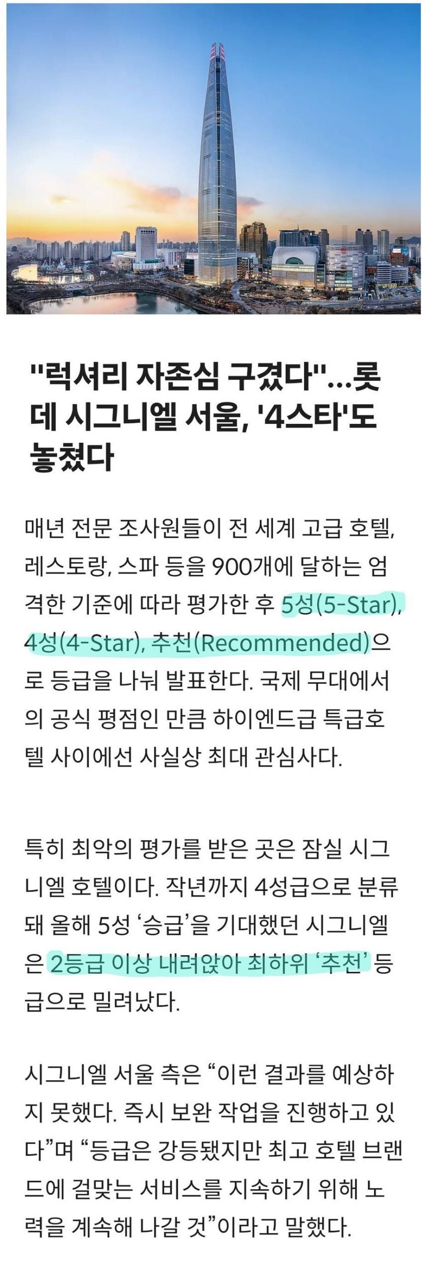 [중앙이코노미뉴스 윤남웅] 국내 럭셔리 호텔로 자리매김해온 시그니엘 서울이 ‘포브스 트래블 가이드 2025’에서 기존의 4스타(★★★★) 등급에서 ‘추천(Reco