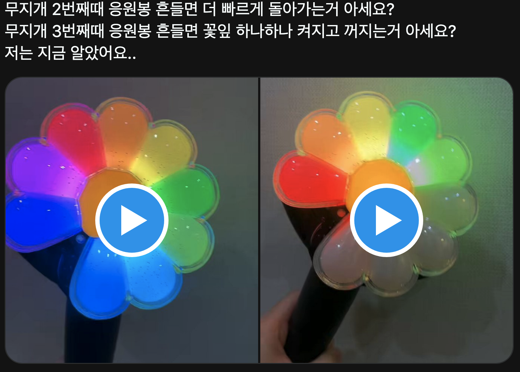 ㅁㅊ 여러분 무지개 2번째때 응원봉 흔들면 더 빠르게 돌아가는거 아세요? 무지개 3번째때 응원봉 흔들면 꽃잎 하나하나 켜지고 꺼지는거 아세요? 저는 지금 알았어요..
