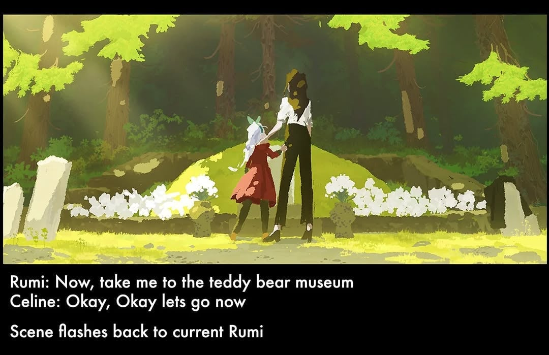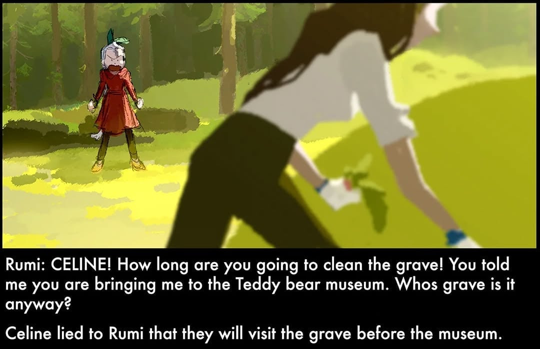 루미 : 셀린! 얼마나 오래 무덤을 청소하고 있을 셈이에요! 테디베어 박물관에 데려다 준다면서요. 그나저나 그건 누구 무덤인데요?