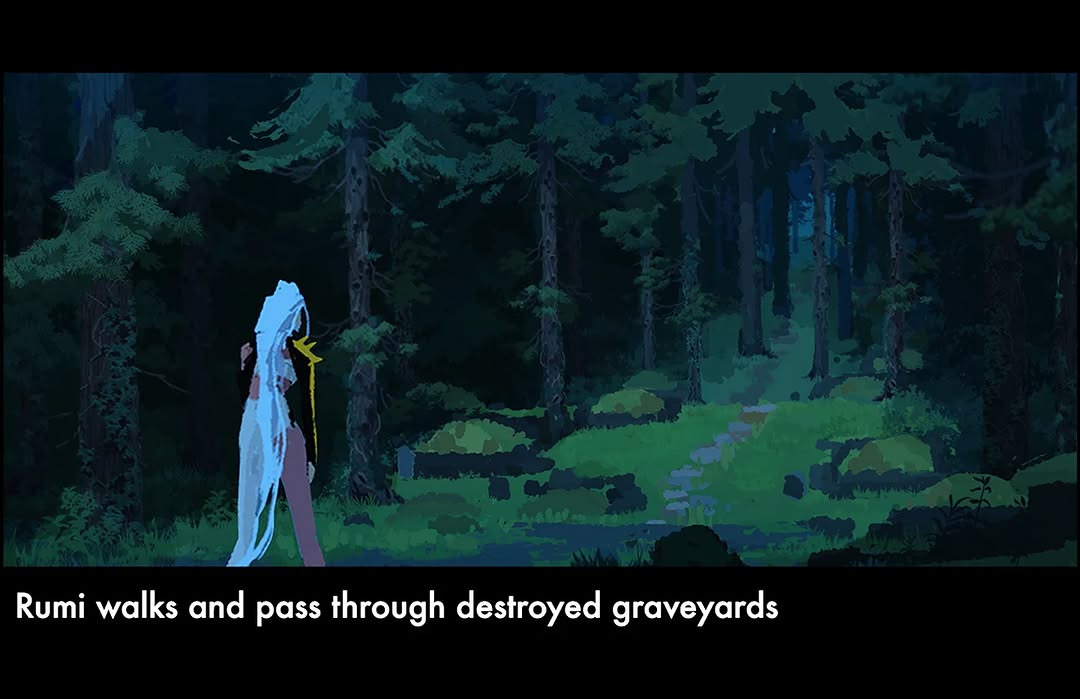 루미는 걸으며 망가진 묘지가를 지나간다.