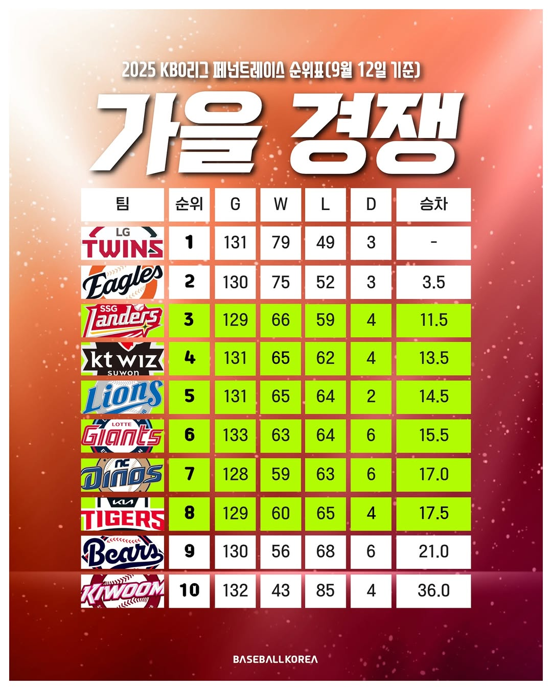 1,2위는 사실상 화정인듯 하고 가을야구 세자리 놓고 싸움