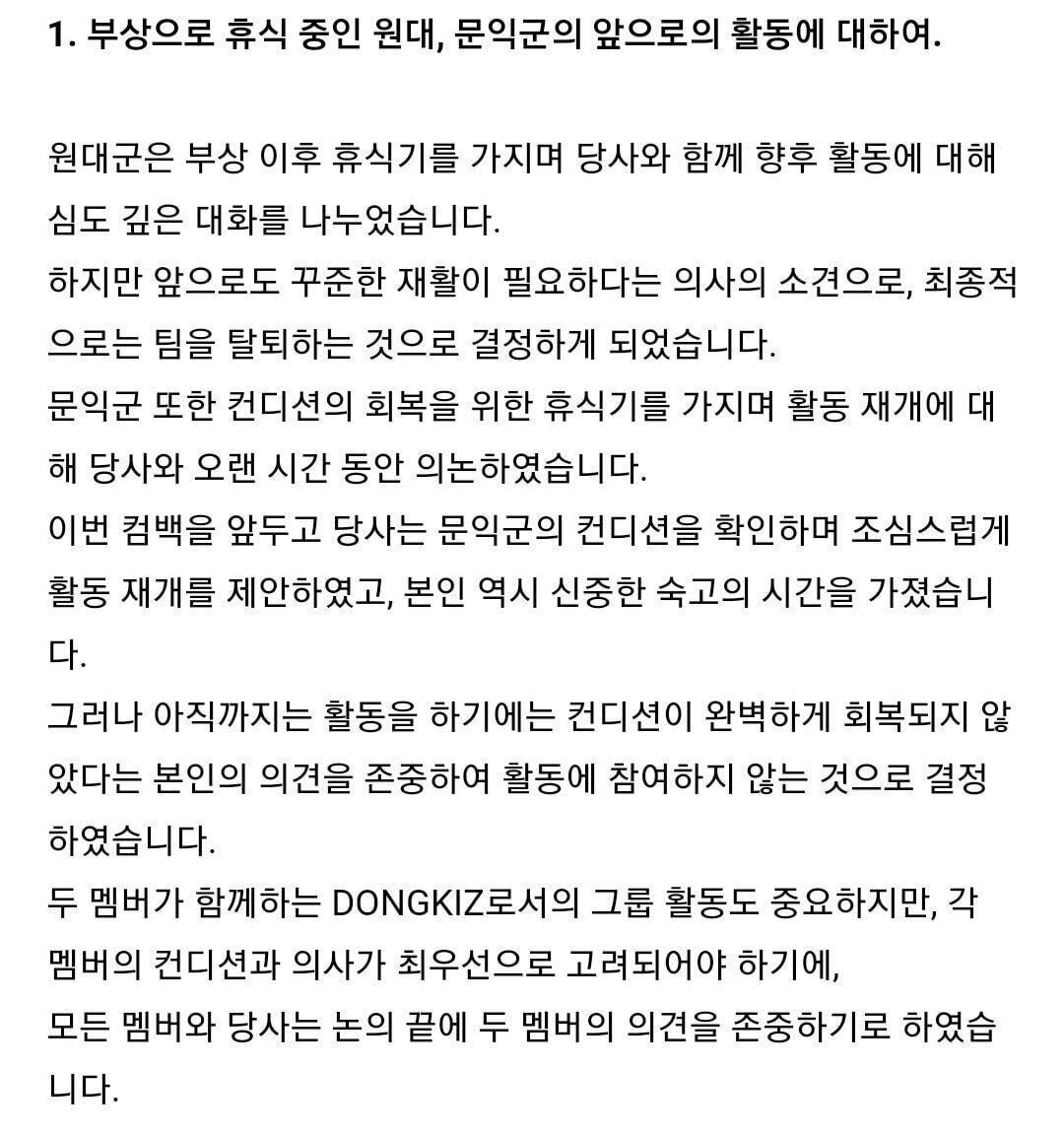 - 기존멤 원대 탈퇴, 문익 이번 활동 휴식