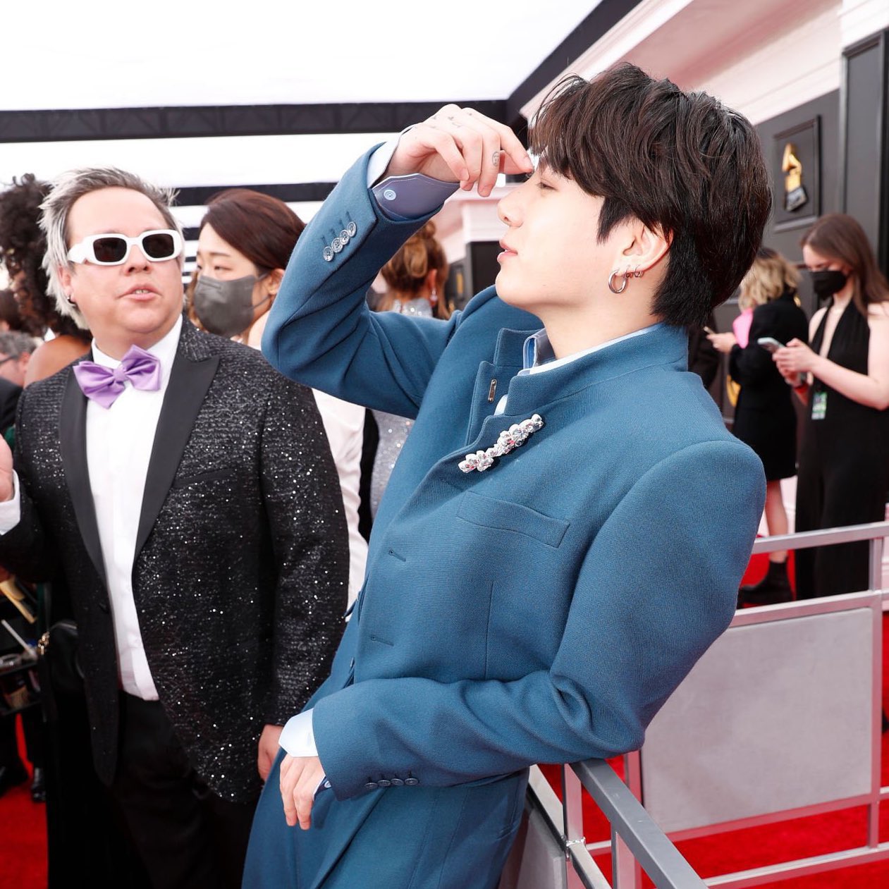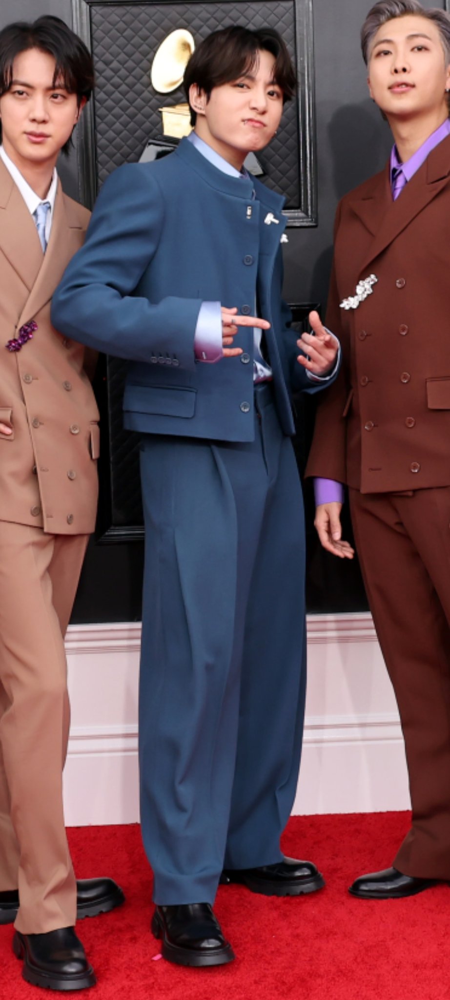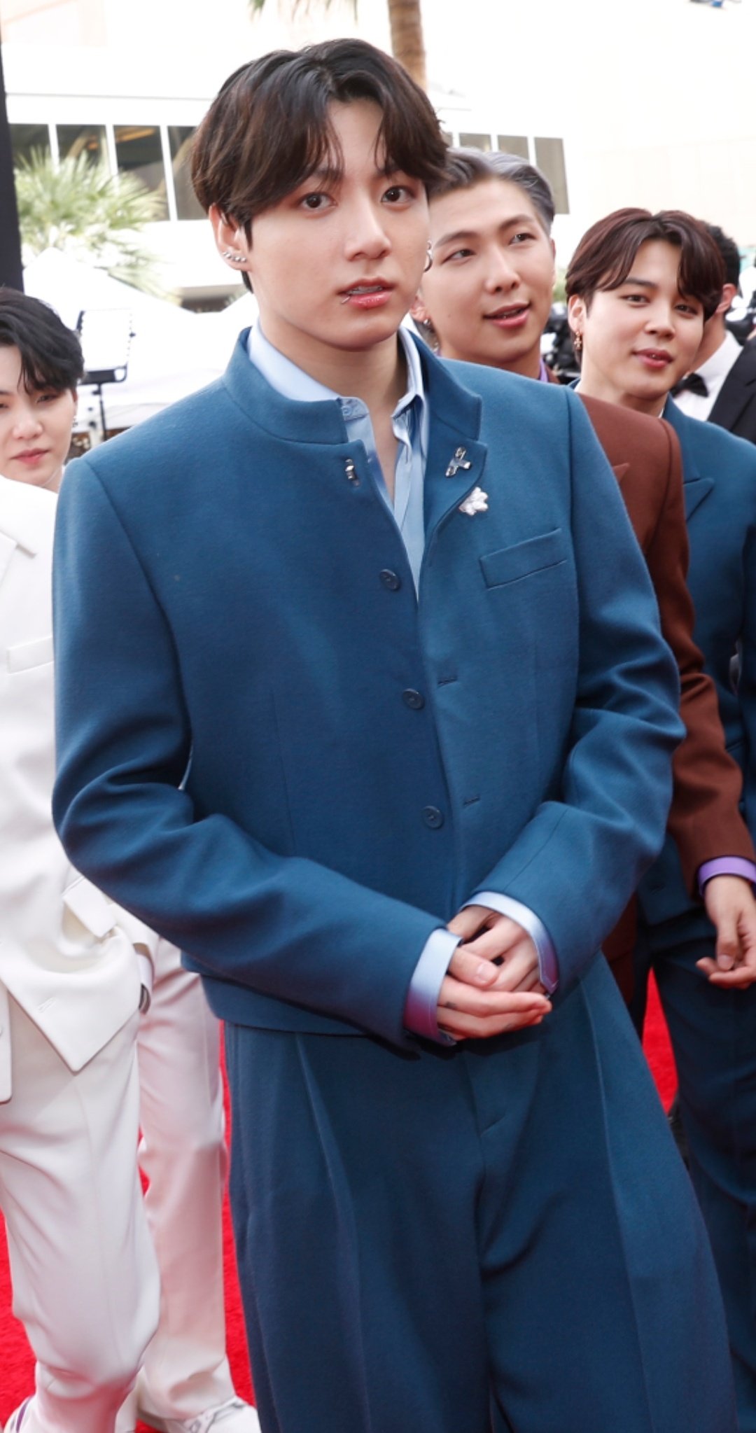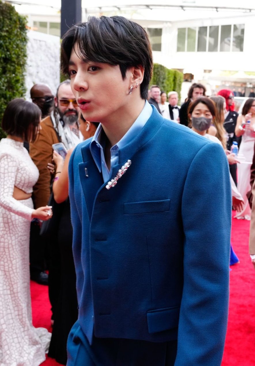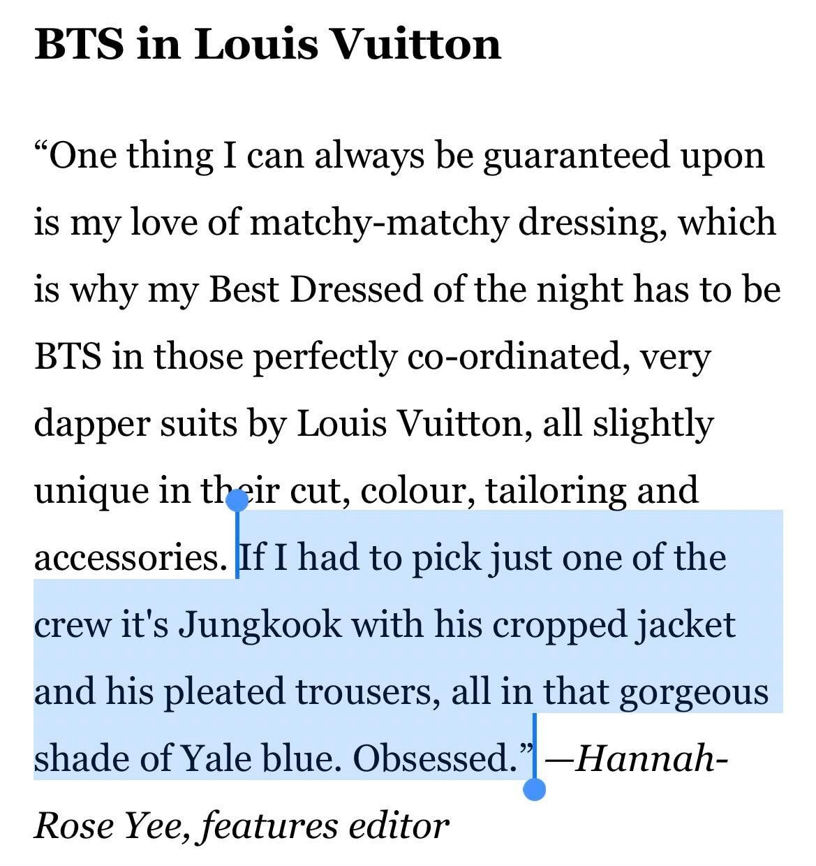 "BTS 중 한명을 뽑자면 고저스한 예일 블루색의 크롭재킷과 플리츠 팬츠를 매치한 정국"